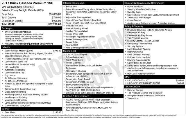 Adorned in a sleek Ebony Twilight Metallic exterior, the Cascada Premium exudes a refined and commanding presence. Step inside and be enveloped in the luxurious black leather-appointed interior, where comfort and technology seamlessly converge. The intuitive navigation system and premium audio system will keep you connected and entertained, while the driver assistance features, including Lane Departure Warning, Front and Rear Park Assist, and Forward Collision Alert, provide an added layer of safety and confidence on the road.