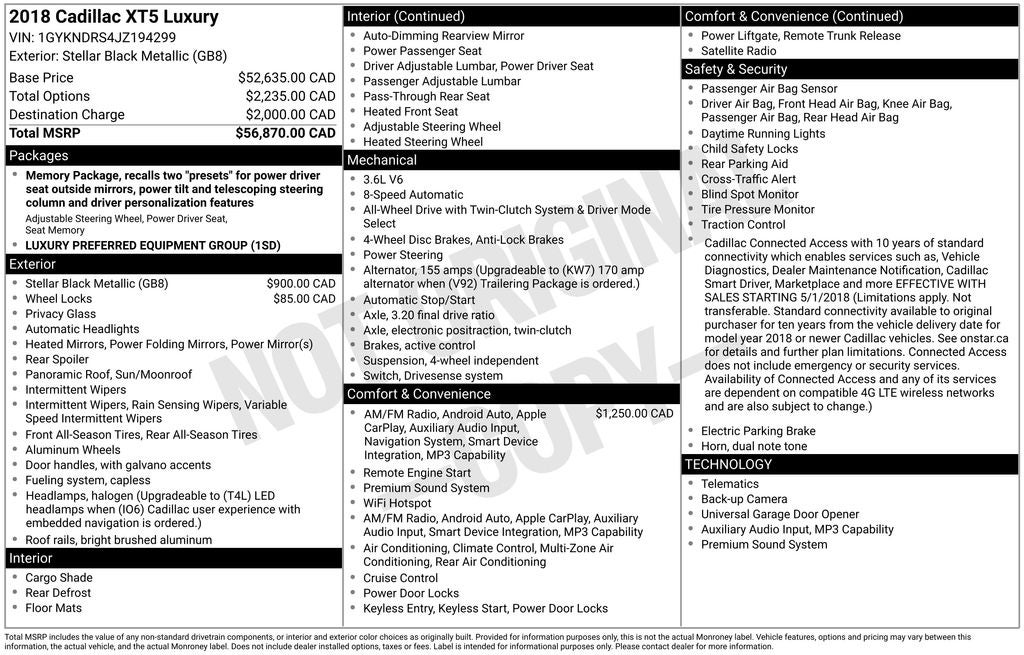 - Emergency communication system: OnStar and Cadillac connected services capable