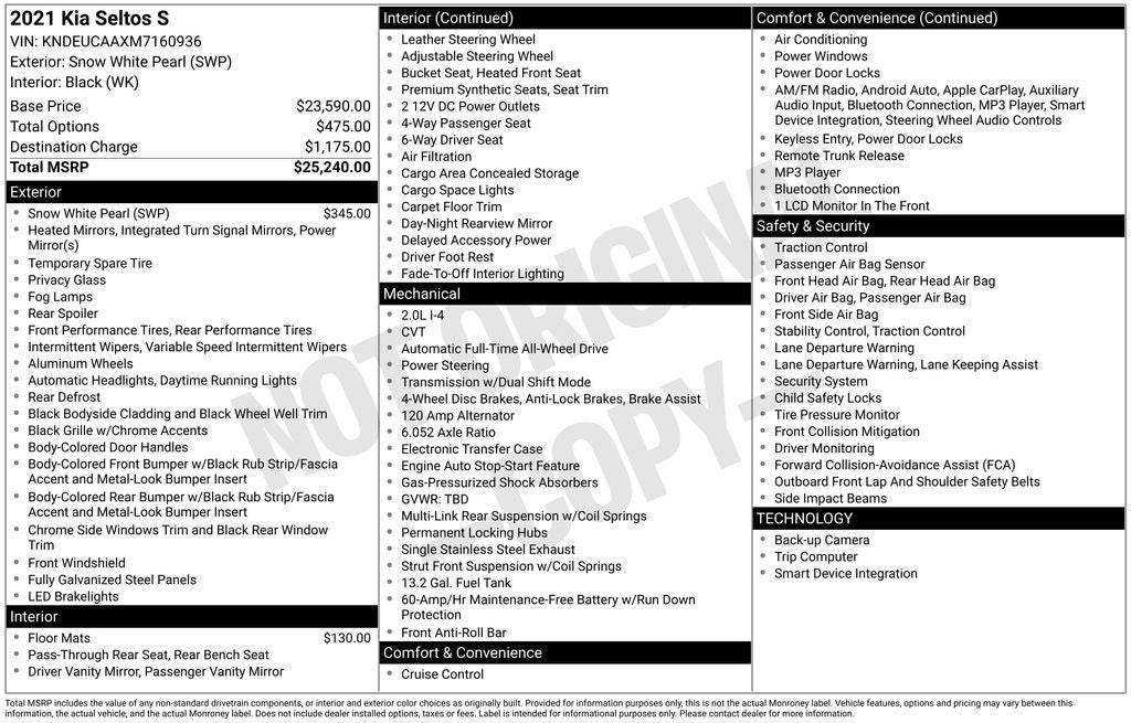 Whether you're navigating the city streets or exploring the open road, the 2021 Kia Seltos S Exterior Parking Camera Rear is the perfect companion. With its exceptional performance, impressive fuel efficiency, and comprehensive suite of features, this SUV is sure to exceed your expectations and elevate your driving experience to new heights.