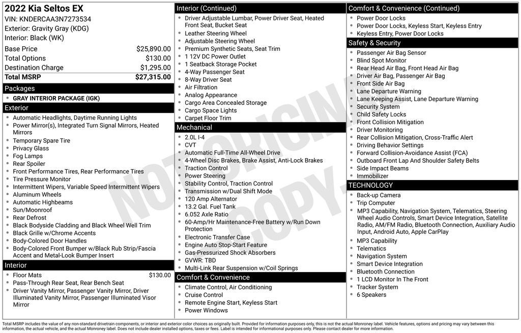 Powered by a 2.0L I4 MPI engine and equipped with AWD, the Seltos EX delivers an exceptional blend of performance and efficiency, with an EPA-estimated 27 city/31 highway MPG. Slip into the supportive and sophisticated Sofino Premium Leatherette seats, and let the navigation system guide you to your destination while you enjoy the convenience of remote keyless entry and the panoramic views from the power moonroof.