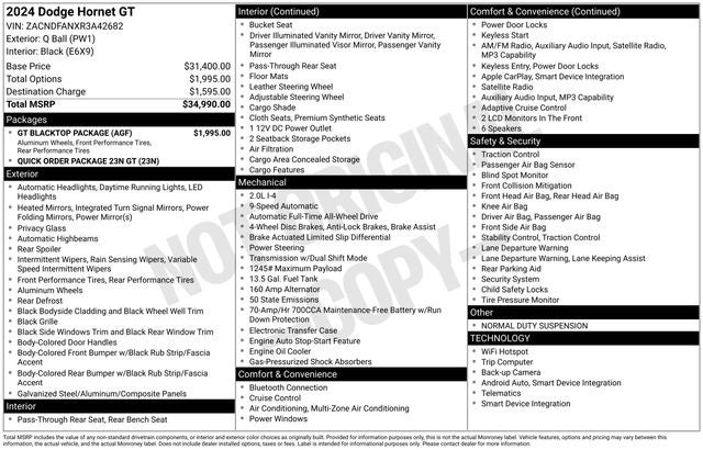 - GT BLACKTOP PACKAGE (Includes Gloss Black Painted Day Light Opening, Tires: 225/55R18 All Season, Wheels: 18 x 7.5 Abyss Finish Aluminum, Dark Hornet Badge, Goodyear Brand Tires, Dark GT Badge, Gloss Black Painted Mirror Caps)