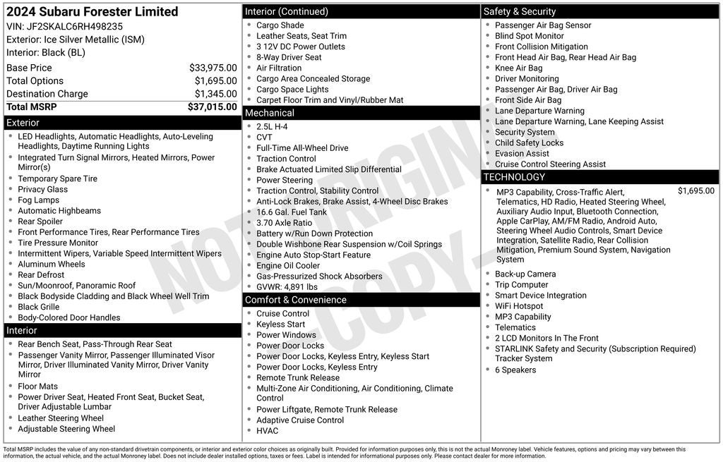 - Radio: Subaru STARLINK 8.0" Multimedia Plus System -inc: AM/FM stereo HD Radio, multi-touch gesture high resolution display screen, voice activated controls, Bluetooth® audio streaming, hands-free phone connectivity and hands-free SMS text messaging connectivity (refer to subaru.com for cell phone compatibility), Near Field Communication (NFC), iPod control capability, SiriusXM All Access radio and SiriusXM Travel Link (4 months free trial/subscription required after), smartphone integration for AHA, Android Auto, Apple CarPlay, Pandora and STARLINK cloud applications (refer to subaru.com for app availability), USB and Over The Air (OTA) audio system update, steering wheel controls for audio and Bluetooth®, 6 speakers, 3.5mm auxiliary input jack and dual USB A input/charge ports